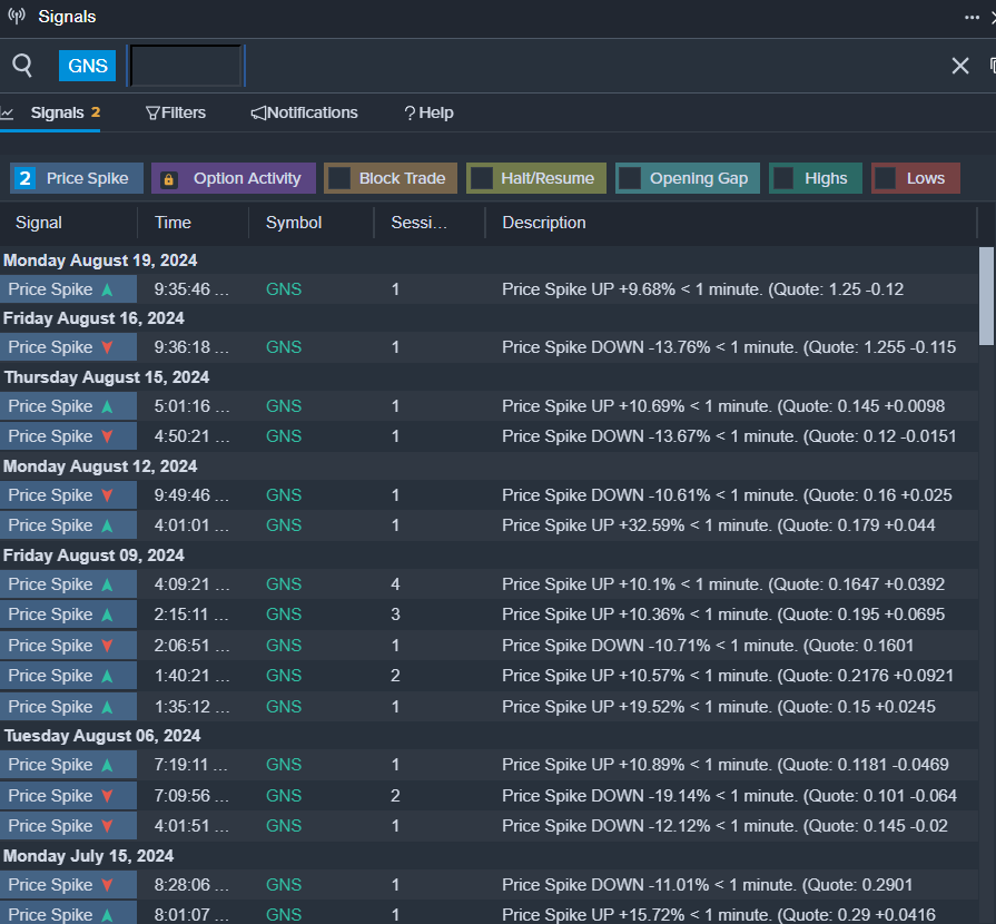 - Benzinga Pro’s signals feature notified of a potential breakout in GNS shares.